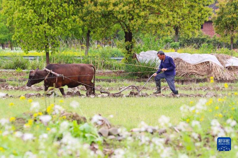3月30日,在湖南省永州市新田县骥村镇黄公塘村,村民在田间用耕牛犁地。