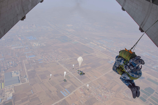 “脚下的万家灯火由我们来守护!大胆离机,大胆跳!”2月28日晚,夜色如墨,豫北某地该旅野外综合训练场上,一架战鹰穿越云层,机舱内,伞训教员翟超正在给即将离机的跳伞员们加油鼓气,这让下连还不足半个月的新兵们紧张的心情逐渐得到了舒缓。