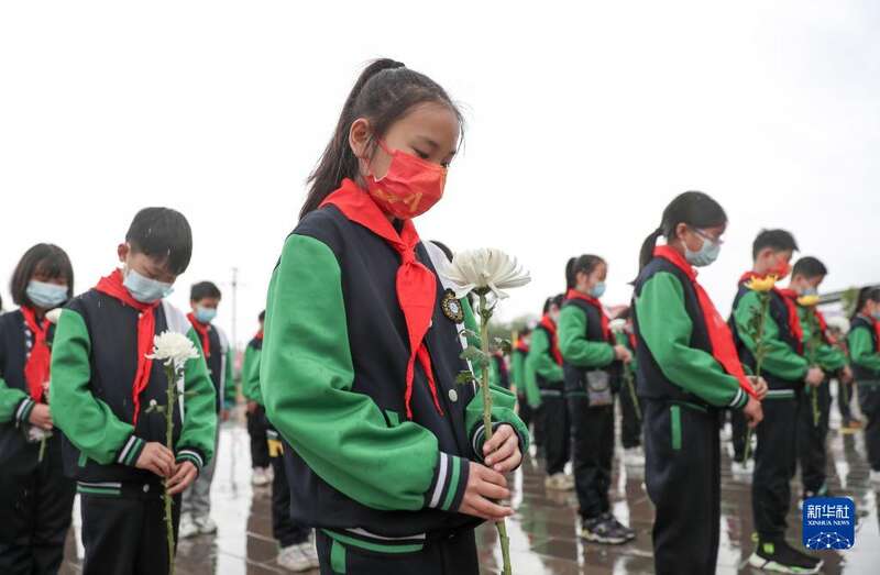 3月31日,秦皇岛市海港区西港路街道玉龙湾社区居民在汤河公园革命英雄纪念碑前默哀。