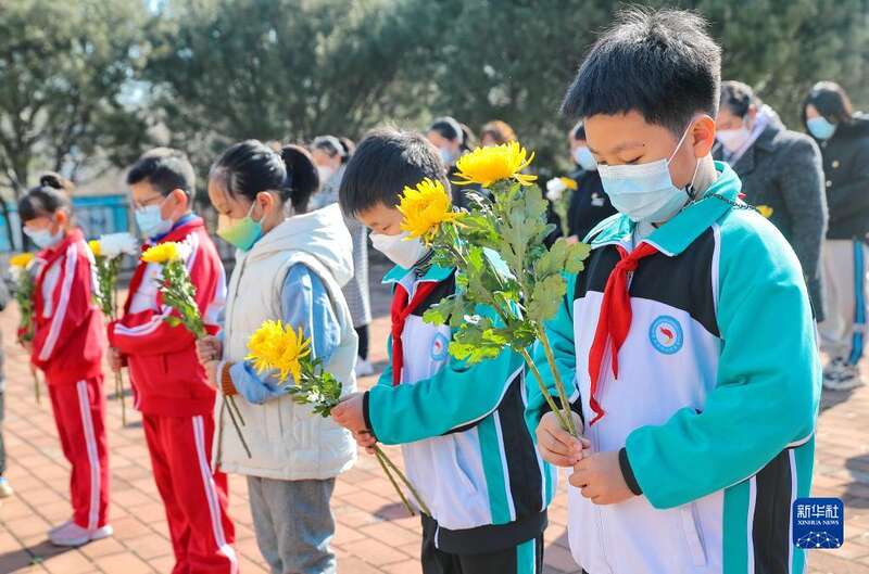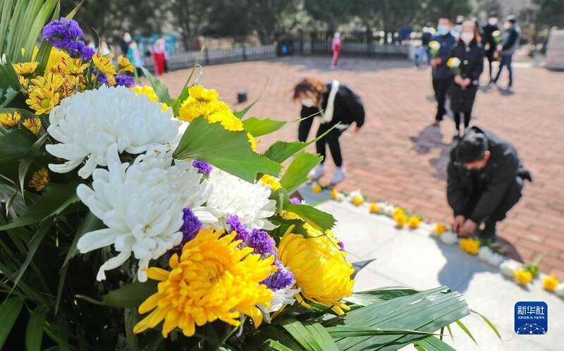3月31日,秦皇岛市海港区西港路街道玉龙湾社区居民在汤河公园革命英雄纪念碑前献花。