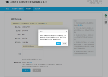 2、在允许填写调剂意向的时间内,一位考生最多可填写10个平行调剂意向,并且提交成功后不可取消或更改。