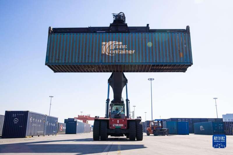 4月1日,在哈尔滨国际集装箱中心站,工作人员调运集装箱进行装车作业。