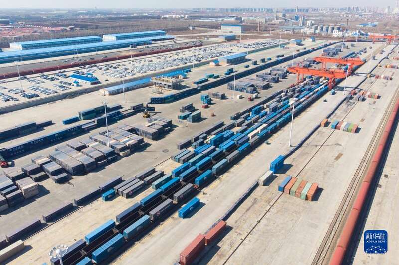 4月1日,在哈尔滨国际集装箱中心站,工作人员调运集装箱进行装车作业(无人机照片)。