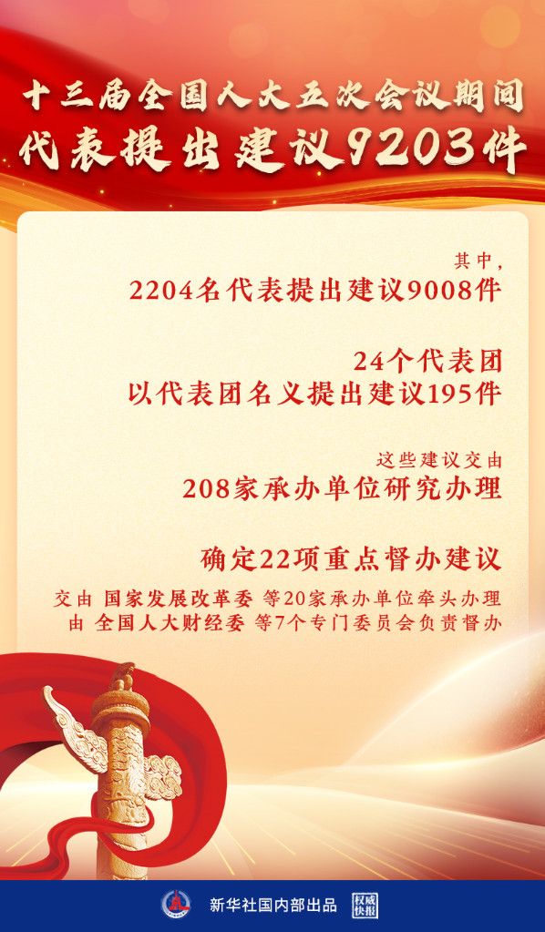 据了解,今年全国人大会议期间代表提出的9203件建议,涉及科教文卫、发展规划、社会公共事务三个方面的代表建议占建议总数的半数以上。代表们坚持发展全过程人民民主,更加密切联系人民群众,基于调研、视察提出的代表建议数量占46%;基于座谈听取群众意见提出的代表建议数量占44%,代表建议质量不断提高。