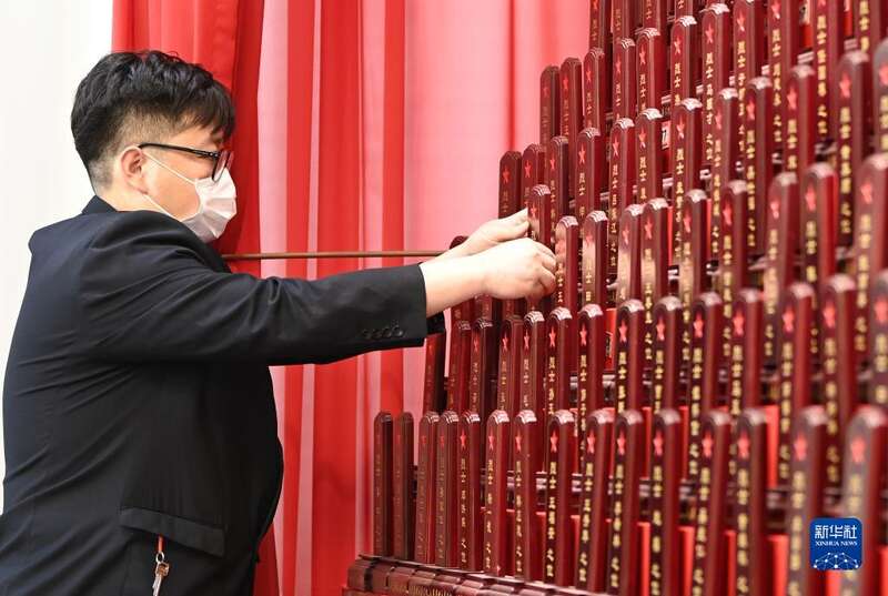 4月4日,在天津市烈士陵园,工作人员高磊在摆放烈士牌位。