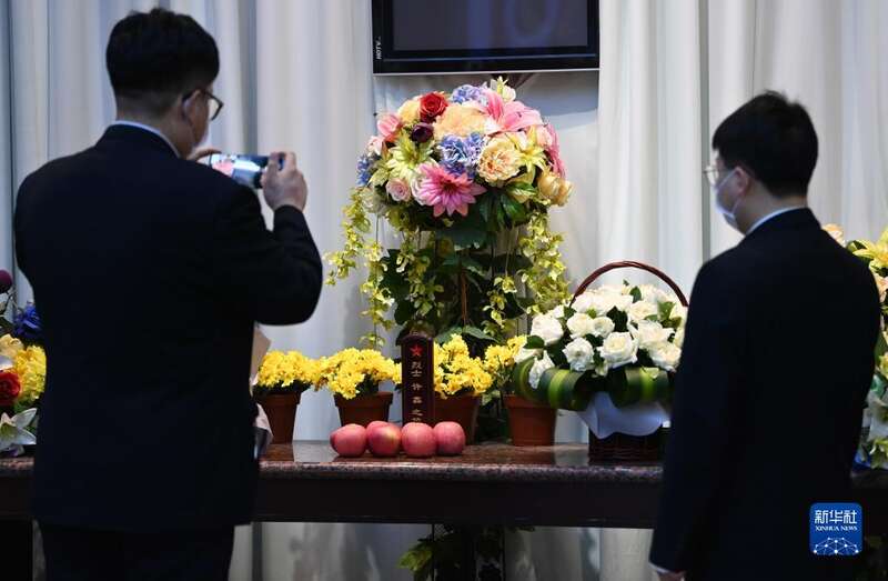 4月4日,在天津市烈士陵园烈士祭悼厅,工作人员高磊(右)为烈士代祭扫,工作人员詹思鹏用手机与烈士家属视频连线。