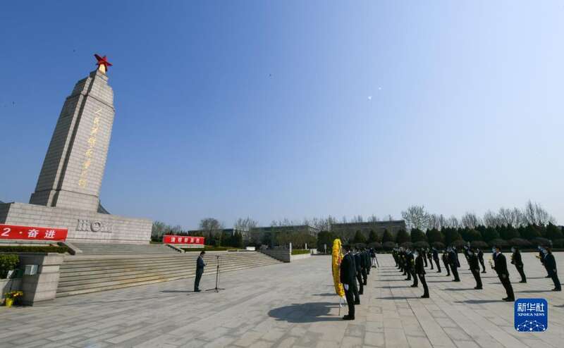 在天津市烈士陵园革命烈士纪念碑前,工作人员进行集体祭扫(4月2日摄)。