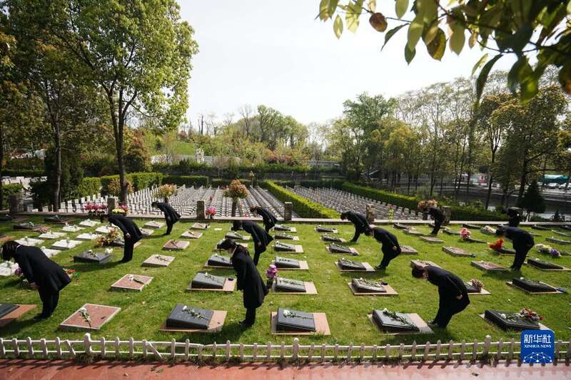 4月4日,在江苏省南京市雨花台功德园,工作人员在墓碑前鞠躬。