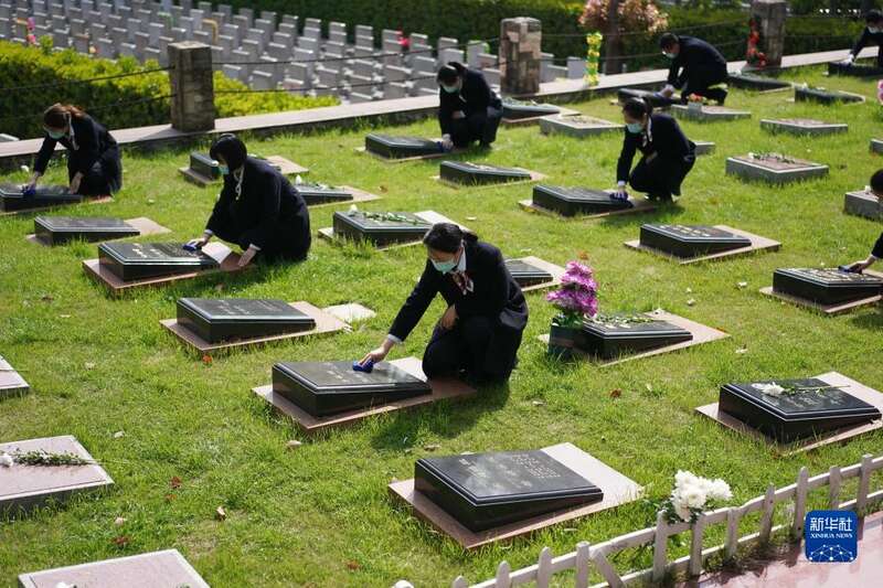 4月4日,在江苏省南京市雨花台功德园,工作人员在擦拭烈士墓碑。