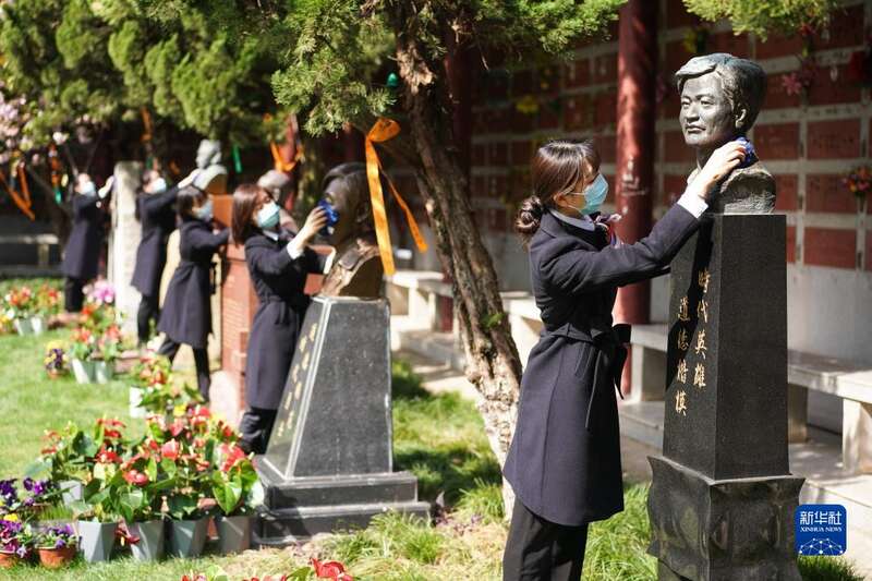 4月4日,在江苏省南京市雨花台功德园,工作人员向烈士献花。