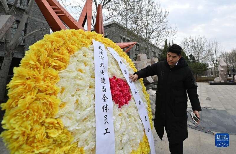 在天津市烈士陵园,工作人员在布置代祭扫时使用的花圈、挽联(3月30日摄)。