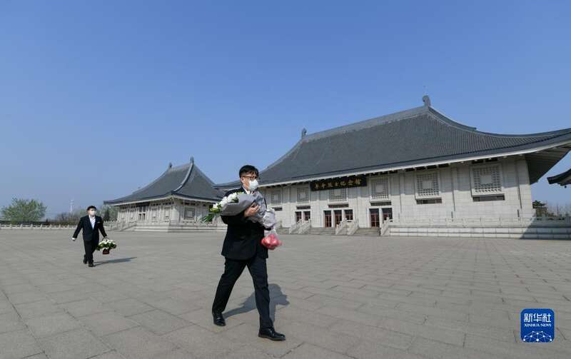 4月4日,在天津市烈士陵园,工作人员手捧烈士家属及亲友送来的鲜花走过革命烈士纪念馆。
