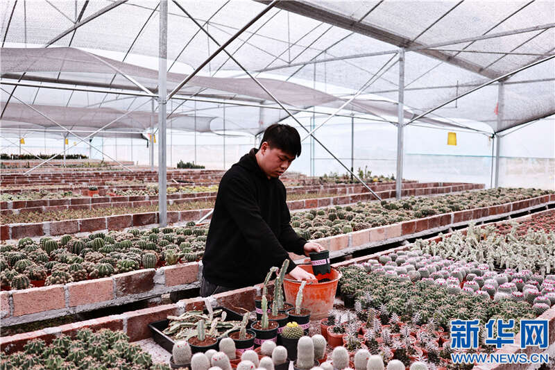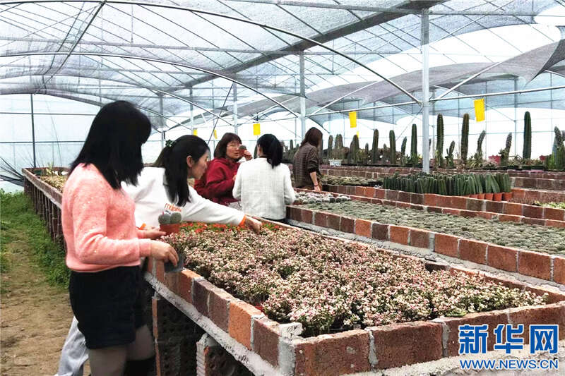 江西省崇义县左溪村多肉种植基地负责人周江福在打理植物。新华网发 严毅君 摄