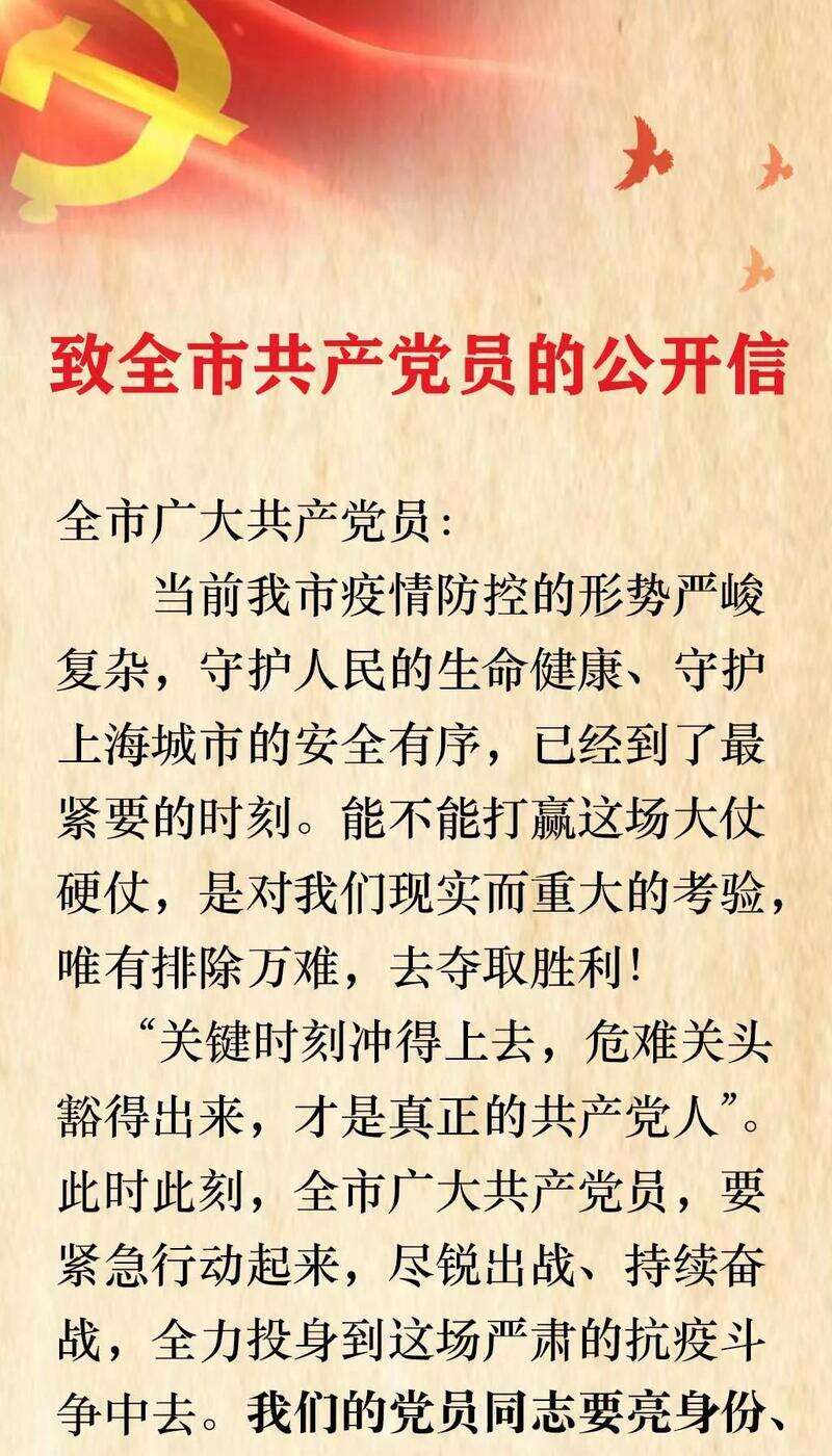 4月6日晚,中共上海市委发布《致全市共产党员的公开信》,号召上海市广大共产党员,紧急行动起来,尽锐出战、持续奋战,全力投身到这场严肃的抗疫斗争中去。