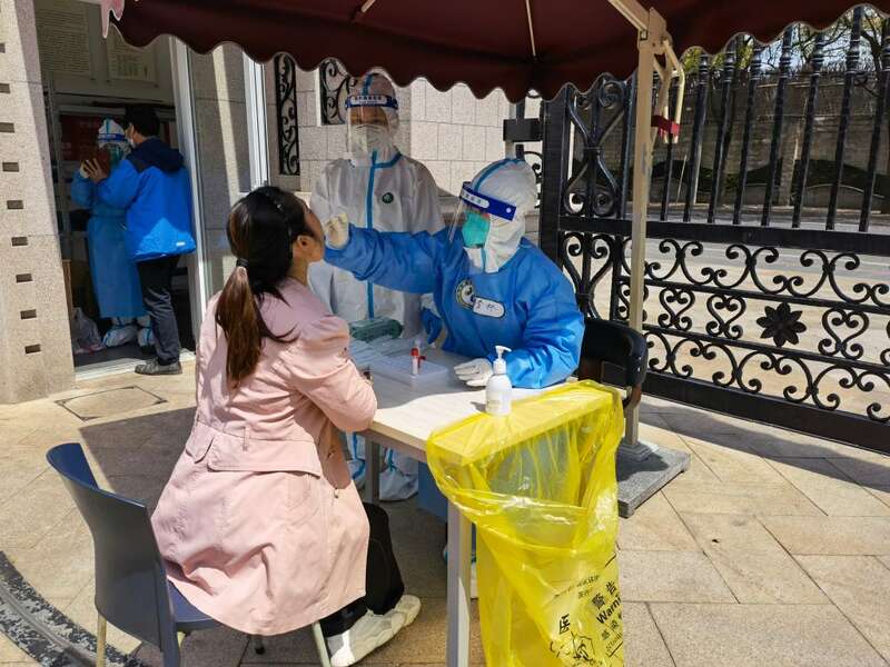 在上海市长宁区,一名武汉援沪医务人员正在为社区居民做核酸。(受访者供图)