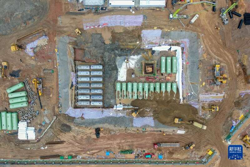 在淤泥地上挖坑建设的化粪池是整个工程难度最大的区域之一(无人机照片,3月25日摄)。