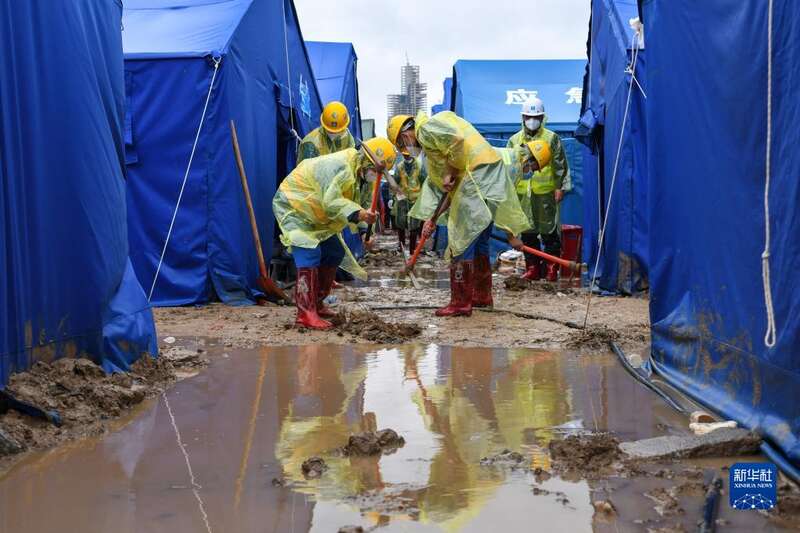 4月2日,工人们冒雨协力奋战。