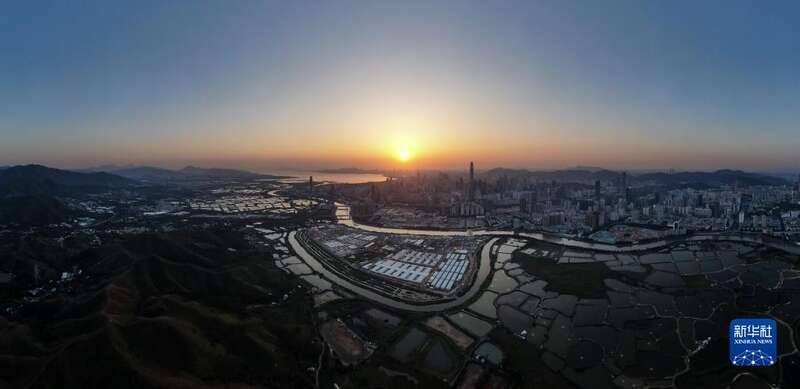 4月3日,夕阳下的落马洲河套地区,中央援港应急医院如一叶方舟(无人机照片)。