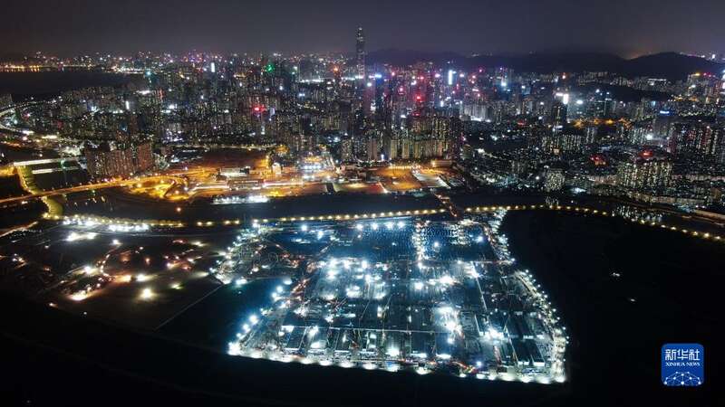 中央援港应急医院建设工地灯火通明(无人机照片,3月17日摄)。