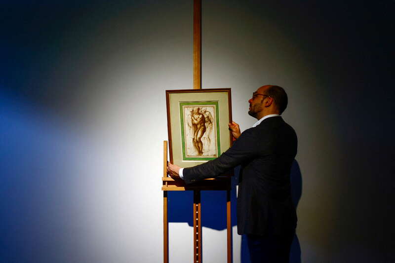 4月5日,在法国巴黎佳士得拍卖行,工作人员展示等待拍卖的米开朗基罗画作。意大利艺术巨匠米开朗基罗的一幅罕见素描定于5月18日在法国首都巴黎拍卖,预估价达3000万欧元(约合2亿元人民币)。佳士得拍卖行5日发布声明说,这幅素描为米开朗基罗早期作品,完成时间可追溯到15世纪末。新华社/路透