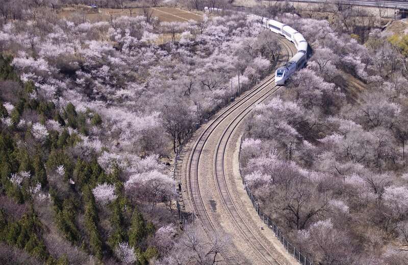 4月2日,北京市郊铁路S2线列车在山花中穿行。春暖花开时节,在北京居庸关长城脚下,山花相继绽放。北京市郊铁路S2线的一列列火车穿行于花海间,成为春日里的一道美丽风景。