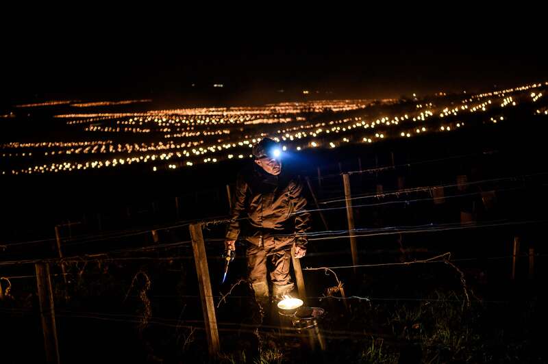 4月4日,种植者在法国皮利尼-蒙拉谢附近的葡萄园里点燃蜡烛。近日,法国部分地区遭遇低温天气,一些葡萄园点燃蜡烛保护果树免遭霜冻灾害。新华社/法新