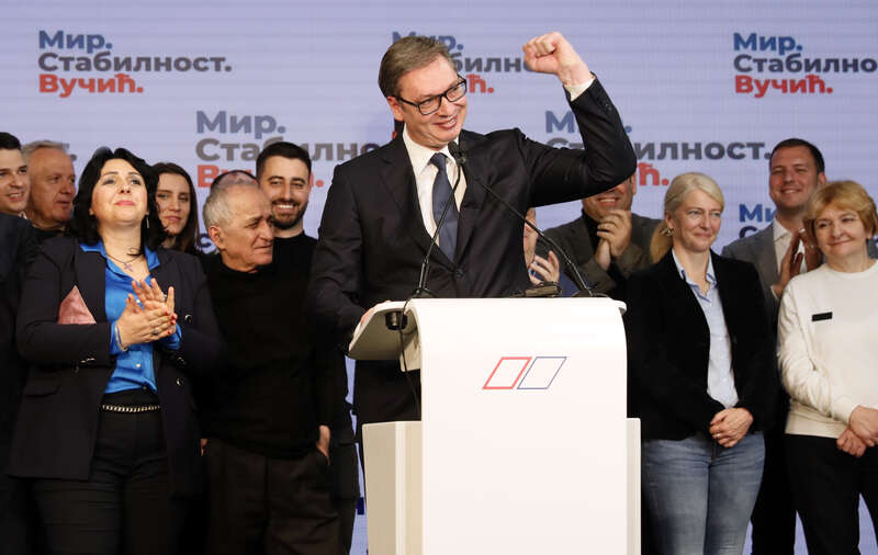 4月3日,塞尔维亚总统武契奇在位于首都贝尔格莱德的塞尔维亚前进党总部讲话。武契奇3日晚宣布,根据塞尔维亚前进党的初步统计结果,他在当天早些时候举行的总统选举中赢得连任。新华社发(普雷德拉格·米洛萨夫列维奇摄)
