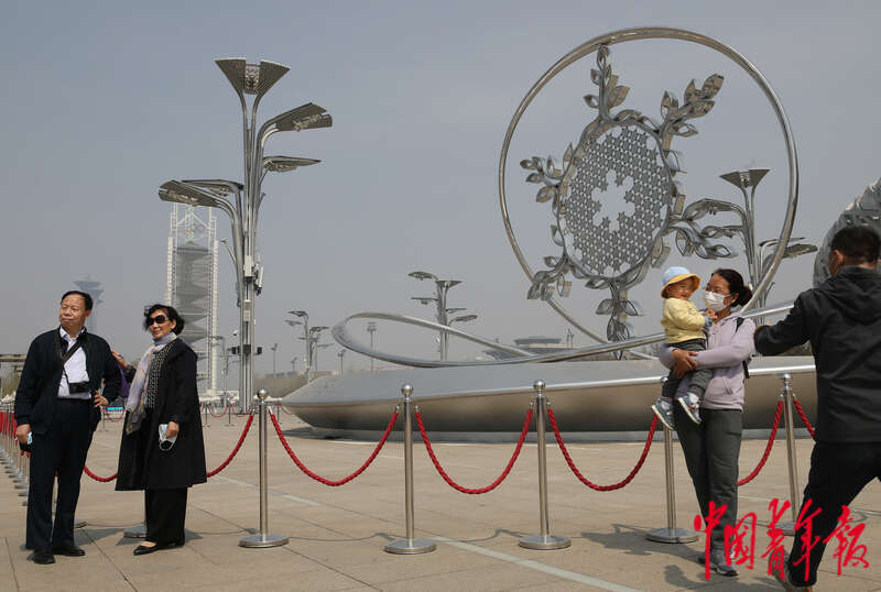 4月8日,北京奥林匹克公园中心区,游客在北京2022年冬奥会和冬残奥会火炬台前拍照留念。中青报·中青网记者 陈剑/ 摄