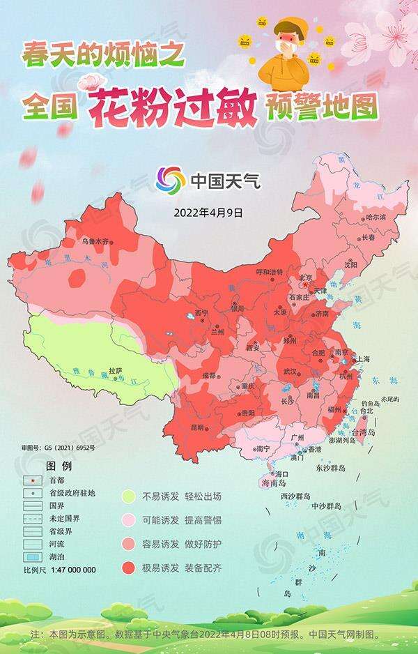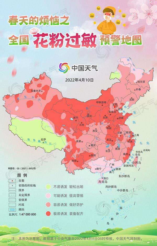 预计本周末(4月9日至10日),我国大部地区晴朗干燥、暖意升级,花粉浓度也将居高不下。中国天气网特别推出全国花粉过敏预警地图,这个周末看哪里需要全套装备护体?
