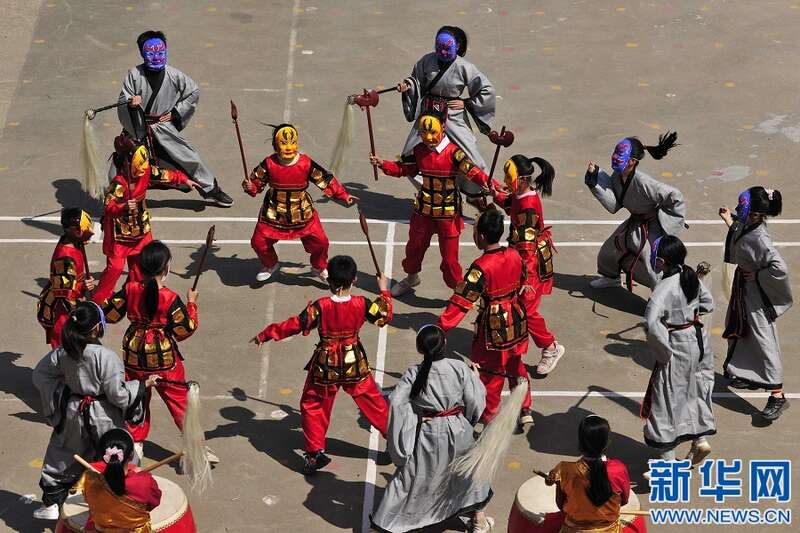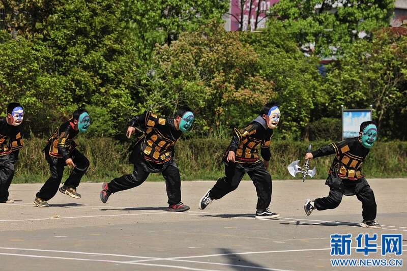 4月6日,江西省宜春市万载县潭埠镇晨兴小学学生在练习国家级非物质文化遗产——傩舞。新华网发 邓龙华 摄