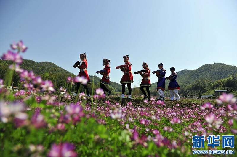 4月7日,江西省宜春市万载县高村镇严田小学学生在操场练习口风琴。新华网发 邓龙华 摄