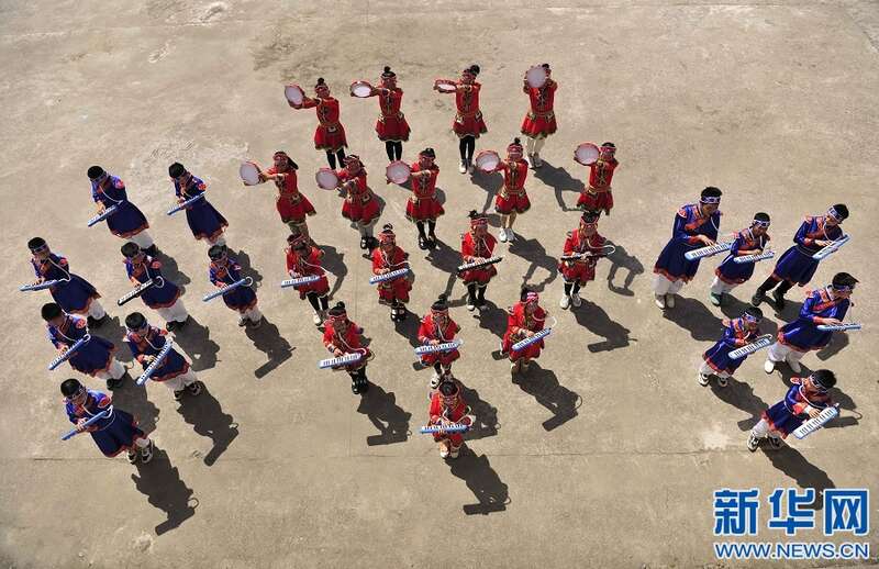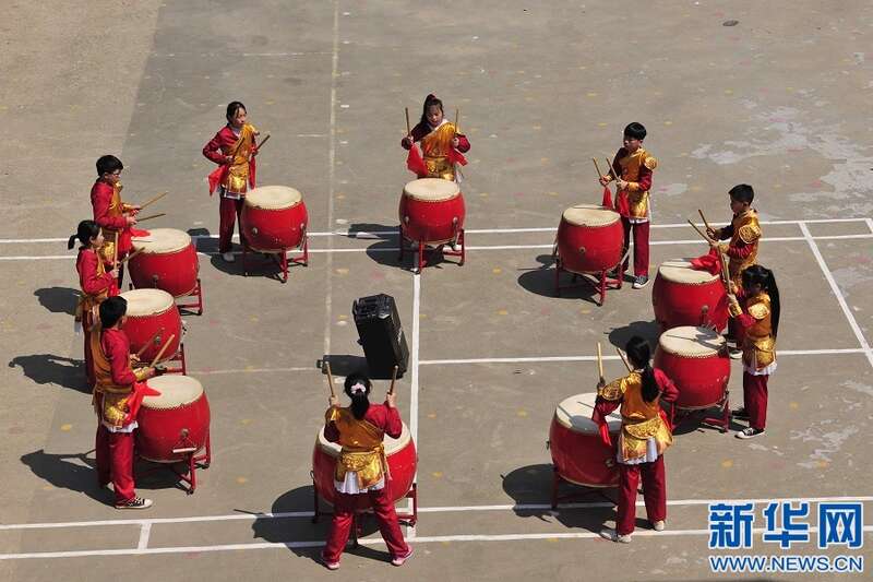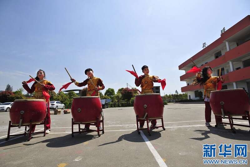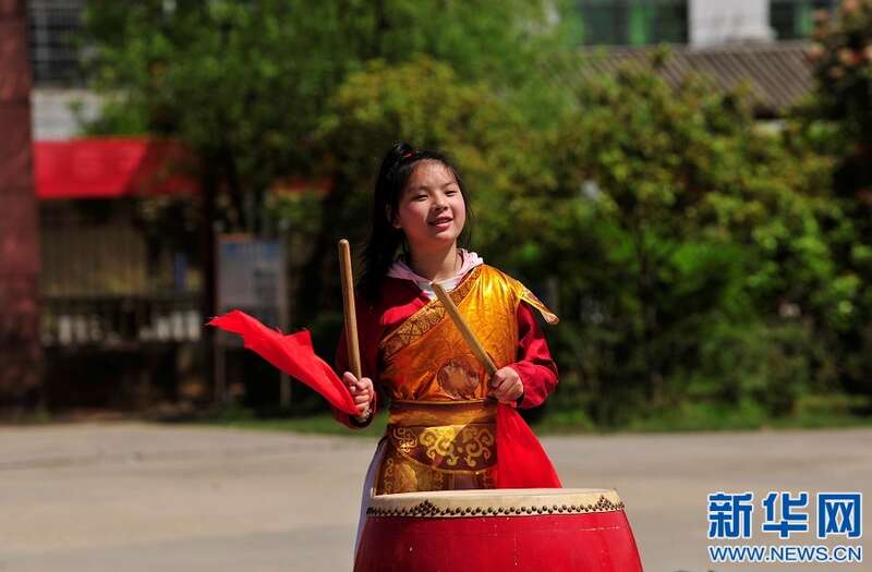 4月6日,江西省宜春市万载县潭埠镇晨兴小学学生在练习国家级非物质文化遗产——得胜鼓。新华网发 邓龙华 摄