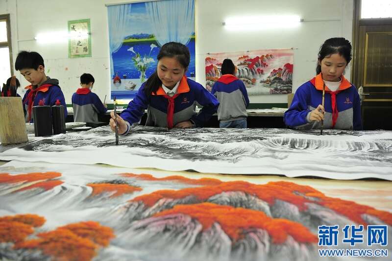 4月6日,江西省宜春市万载县白水乡中心小学学生在学习描绘山水画。新华网发 邓龙华 摄