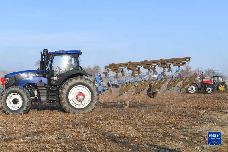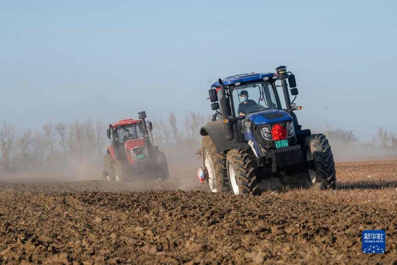 在新疆乌苏市石桥乡的一处棉田里,国产大马力拖拉机在犁地(3月31日摄)。