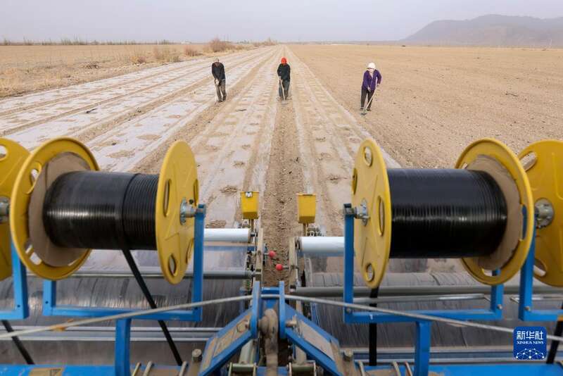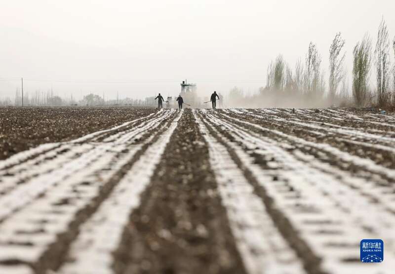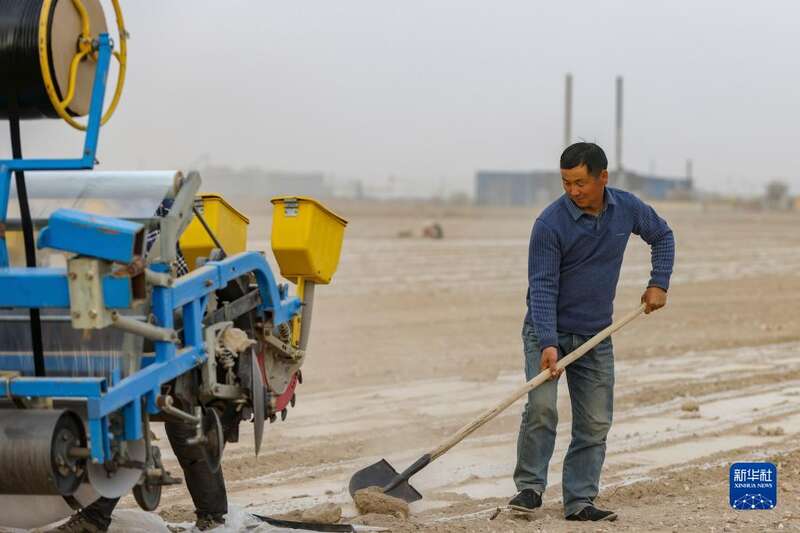 4月8日,在新疆巴音郭楞蒙古自治州博湖县博斯腾湖乡库代力克村棉田里,棉农辅助盖压地膜。
