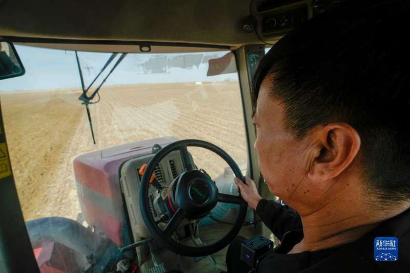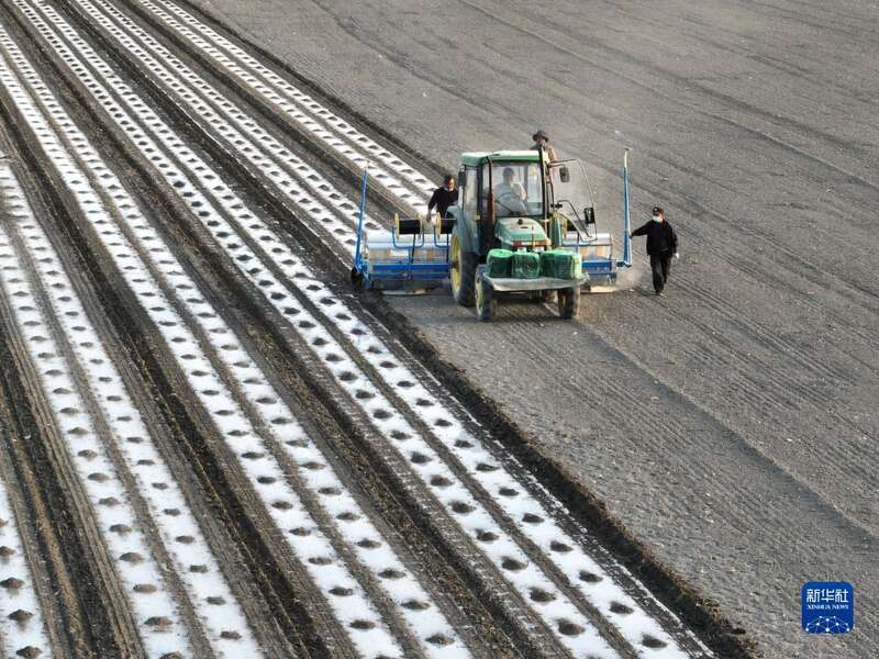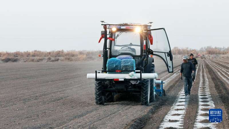 在新疆巴音郭楞蒙古自治州库尔勒市和什力克乡一处棉田里,棉农使用装有北斗卫星导航系统的播种机播种棉种(4月3日摄)。