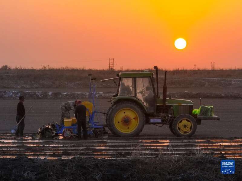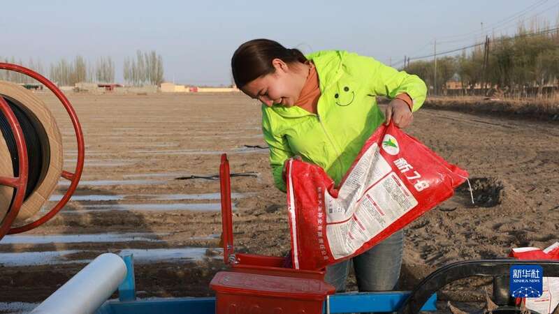 新疆阿克苏地区沙雅县塔里木乡棉农在为播种机添加棉种(4月3日摄)。