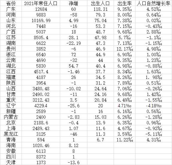 从增量变化来看,广东2021年人口增加了60万人,在各省份中仅次于浙江,位居第二,不过与浙江增量人口主要是省外流入不同,广东的增量人口多,主要是得益于出生率较高,出生人口多,人口自然增长率高。