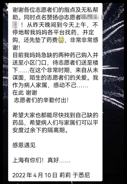 通过这份文档解决困难的人,不少会来反馈,或者发感谢的短信。有人邀请志愿者等疫情结束,来家里坐坐,有人想送面锦旗。“我们是一支临时的团队,由一份共享文档相连结,甚至算不上组织,不用了。”