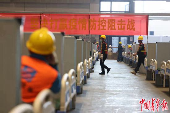 4月8日,上海市青浦区国家会展中心,施工现场拉起横幅——坚决打赢疫情防控阻击战。这处上海最大的方舱医院从4月5日开始动工,工人们在其中夜以继日地劳作着。 中青报·中青网记者 李强/摄