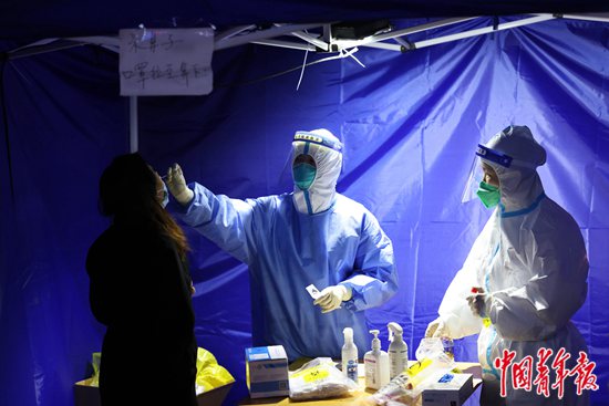 4月9日晚,上海市黄浦区,在街头一处核酸采样点,医护人员正在采集一位居民的鼻拭子。 中青报·中青网记者 李强/摄