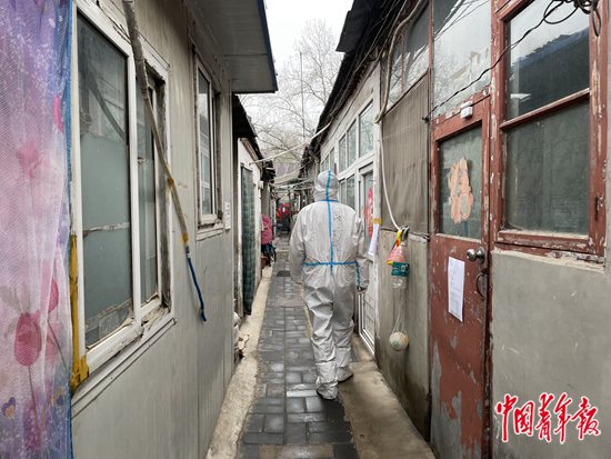 北京市东城区北新桥街道的防控工作者在胡同封控区巡查。 中青报·中青网记者 刘昶荣/摄
