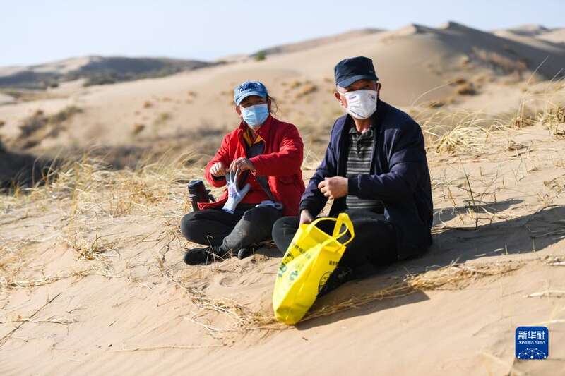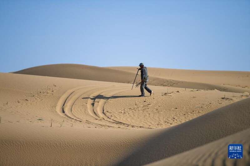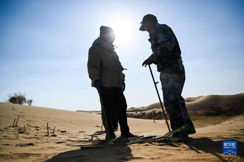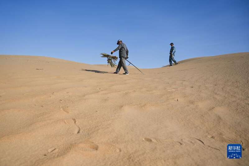 内蒙古自治区达拉特旗银肯塔拉生态旅游区地处库布其沙漠。近日,工人们来到沙漠中种树治沙,为沙漠增添绿色。