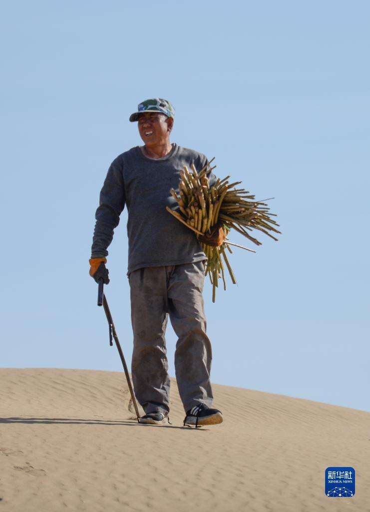4月18日,工人在银肯塔拉生态旅游区搬运沙柳树苗。
