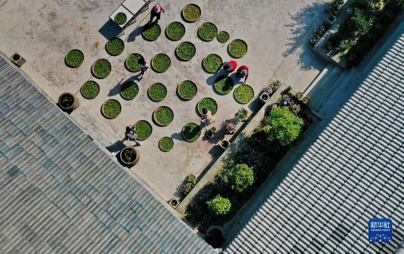4月21日,在四川省南充市营山县明德乡石狮村合作社,村民晾晒春茶(无人机照片)。