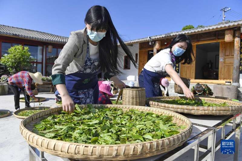4月21日,在四川省南充市营山县明德乡石狮村合作社,村民晾晒春茶。