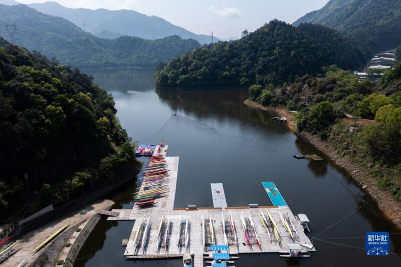 4月21日,运动员划着赛艇从码头出发在千岛湖水域进行训练(无人机照片)。