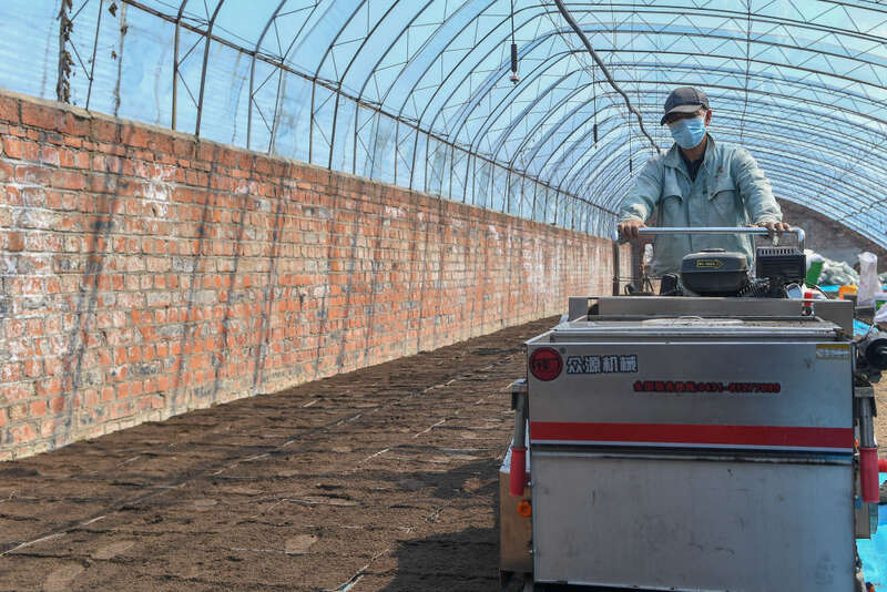 4月15日,在吉林省吉林市龙潭区江北乡棋盘村,农民操作水稻秧盘播种机进行育苗工作。新华社记者 张楠 摄