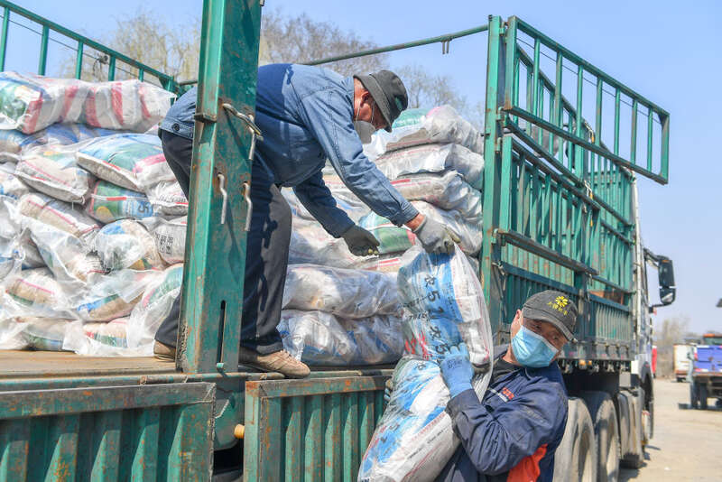 4月15日,在吉林省吉林市龙潭区江北乡棋盘村,农民在搬运农资。新华社记者 张楠 摄