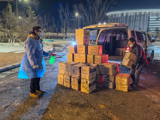 3月17日,东北师范大学净月校区大门,工作人员正在对转运画材物资进行交接消杀。3月15日,东北师大采取静态管理模式。恰逢研究生复试在即,美术专业的考研学生急需一批专业画材物资。美术学院克服困难,购置基础画材,并赠予学院在校学生。东北师范大学供图